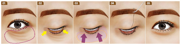 通过下睑结膜内切口,于睑板下缘切开结膜后分开睑板肌肉,暴露突出的内侧及中间脂肪团块,剥离泪沟凹陷处,将突出的脂肪牵拉固定于泪沟处,祛除眼袋同时解决泪沟问题,综合年轻化眶下区域。