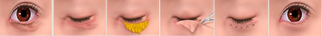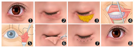 在睫毛下1-2mm处做横行皮肤切口,内至内眦处,外至外眦角外缘5-10mm,分离皮肤及眼轮匝肌后,打开眶隔,适量去除突出的脂肪后,将脂肪重新分布固定于泪沟凹陷处,同时适量去除松弛皮肤,拉平眶下皮肤皱纹。并根据顾客需求通过矫正眼轮匝肌重新塑造卧蚕,祛除眼袋的同时,实现眼部综合美化的明显高效。对人群:年长患者,脂肪突出同时伴随皮肤松弛明显,下睑中度膨隆的患者。